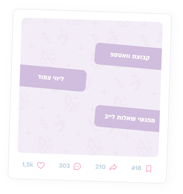 השאלות הכי טובות עולות בין השיעורים, לכן יש קבוצת וואטסאפ של הקורס לשאלות מהירות ומפגש זום אחת לשבוע של שאלות ותשובות עם נופר ונוי. כי אנחנו יודעות שהכוח האמיתי להצלחה שלך מסתתר בפרטים, ורוצות שתקבלי תשובות לכל מה שעולה לך.