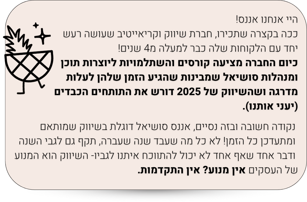 ברוכה הבאה לצעד הראשון שלך. צעד ראשון למקצוע אמיתי מהדבר שאת כבר עושה כל יום. אם את רוצה להיכנס לתחום כמנהלת סושיאל רווחית, הגעת למקום שיתן לך את כל הכלים לעשות את זה! הקורס הוא הצעד הראשון שלך לשירות מסודר, מחירון ברור, לקוחות אמיתיים. צעד ראשון לזה שמישהו סוף־סוף משלם לך על מה שאת עושה מעולה.
