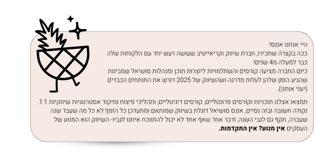 העמוד נבנה ונוצר ע״י אננס סושיאל בע״מ האדירות אם לא היה ברור